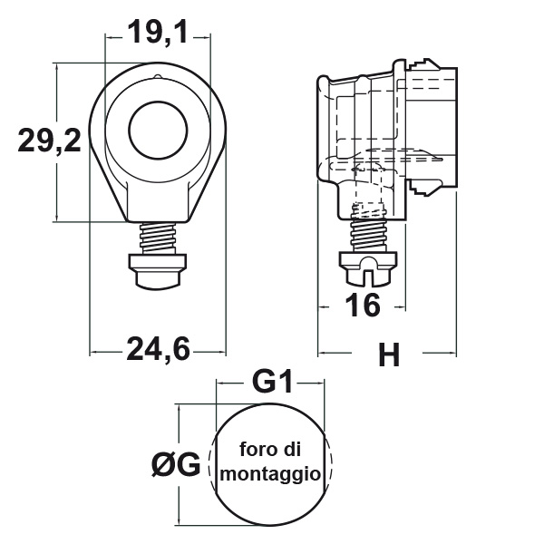 Caratteristiche: questi bloccacavi presentano una buona resistenza ai prodotti chimici e buone proprietà elettriche. Offrono una valida protezione elettrica e meccanica ai cavi, assorbendo le forze di trazione, spinta e torsione che possono essere esercitate sui cavi stessi. Sono conformi ai requisiti europei (IEC #335, CEE #10 e CEE #11) che prevedono che i bloccacavi rimangano ancorati alla struttura nel caso in cui si debba sostituire o rimuovere il cavo. Sono dotati di una vite in plastica che, facendo pressione su una linguetta posta all'interno, blocca il cavo e che, anche se svitata, non può essere rimossa dal corpo. Hanno, inoltre, un’imboccatura svasata che consente al cavo ampi movimenti, evitandogli il pericolo di danneggiamento. Possono essere installati in fori di montaggio tondi (ØG), ma se si effettua un foro avente la sagoma da noi indicata nel disegno (G1) il bloccacavo non potrà ruotare. Per tappare i fori con questa sagoma sono disponibili i tappi “DOUBLE” tipo DD. I bloccacavi sono adatti per cavi piatti e tondi. Grazie ai dentini di fissaggio, questi bloccacavi si fissano a scatto senza l’ausilio di utensili e si adattano allo spessore del telaio fino ad un massimo indicato in tabella.