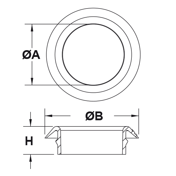 ARTICOLO | ØA mm | ØB mm | H mm | spessore telaio mm | Ø foro montaggio mm | confezione pz. |