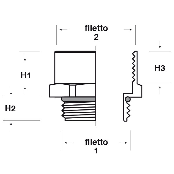 ARTICOLO | filetto passo 1 | filetto valore 1 | filetto passo 2 | filetto valore 2 | chiave mm | H1 mm | H2 mm | H3 mm | confezione pz. | |