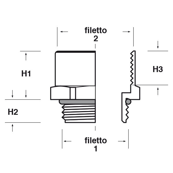 ARTICOLO | filetto passo 1 | filetto valore 1 | filetto passo 2 | filetto valore 2 | chiave mm | H1 mm | H2 mm | H3 mm | confezione pz. |