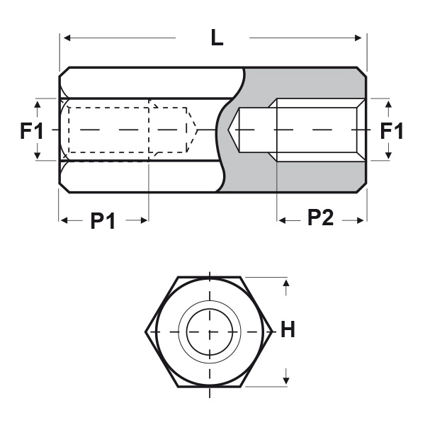 ARTICOLO | filetto passo F1 | filetto valore F1 | H mm | L mm | P1 min mm | P2 min mm | confezione pz. | |