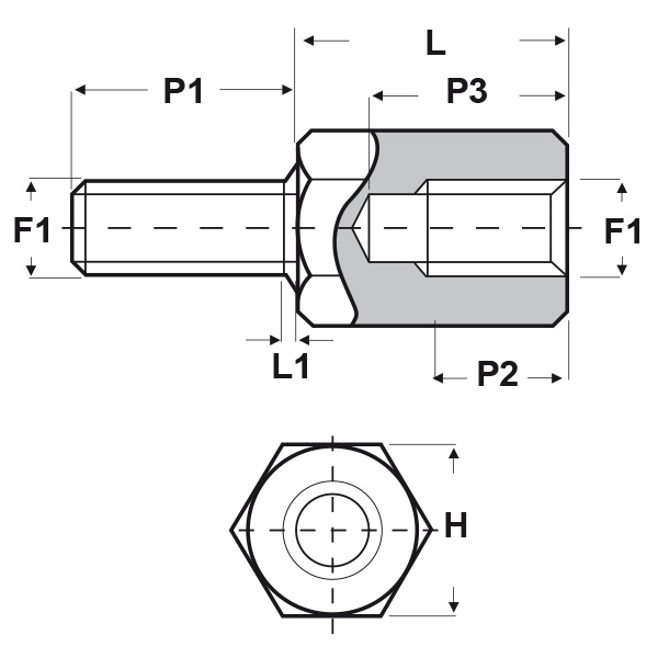 ARTICOLO | filetto passo F1 | filetto valore F1 | H mm | L mm | L1 max mm | P1 mm | P2 min mm | P3 max mm | confezione pz. | |