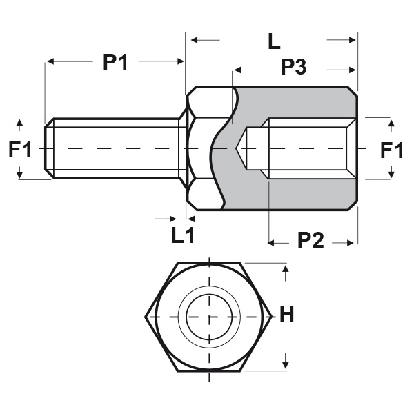 ARTICOLO | filetto passo F1 | filetto valore F1 | H mm | L mm | L1 max mm | P1 mm | P2 min mm | P3 max mm | confezione pz. |
