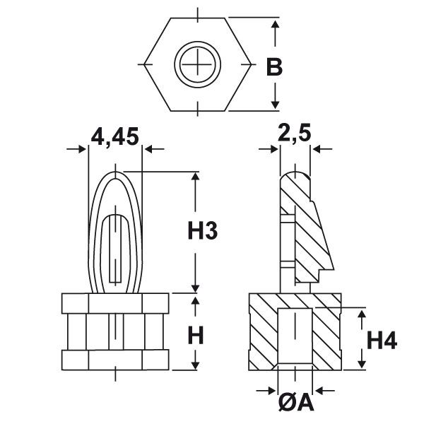 ARTICOLO | colore | materiale | ø foro di montaggio superiore mm | spessore telaio superiore mm | ØA mm | H mm | B mm | H3 mm | H4 mm | confezione pz. |