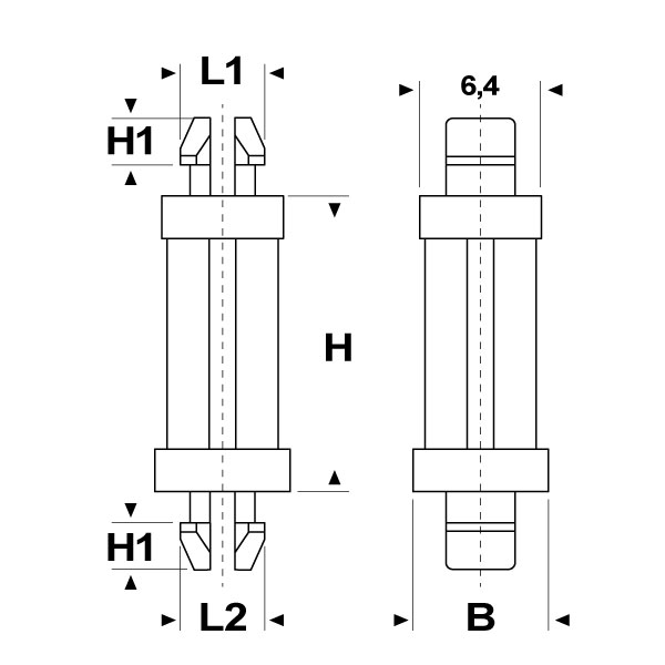 ARTICOLO | colore | ø foro di montaggio superiore mm | spessore telaio superiore mm | ø foro di montaggio inferiore mm | spessore telaio inferiore mm | B mm | H mm | H1 mm | L1 mm | L2 mm | confezione pz. | |