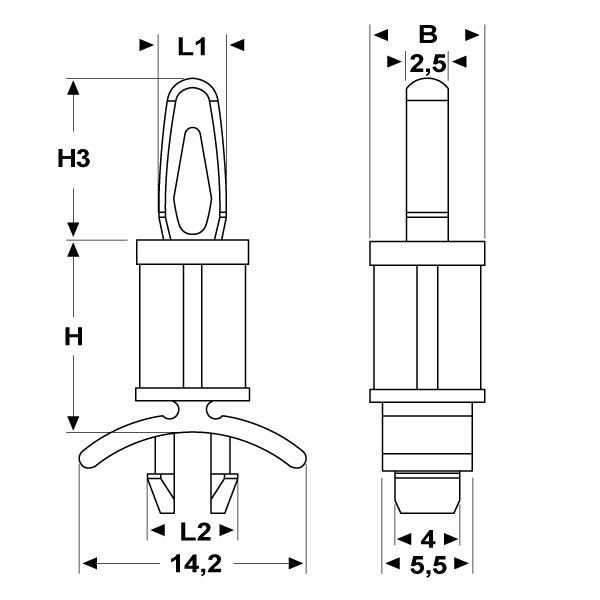 ARTICOLO | colore | materiale | ø foro di montaggio superiore mm | spessore telaio superiore mm | ø foro di montaggio inferiore mm | spessore telaio inferiore mm | B mm | H mm | H3 mm | L1 mm | L2 mm | confezione pz. | |