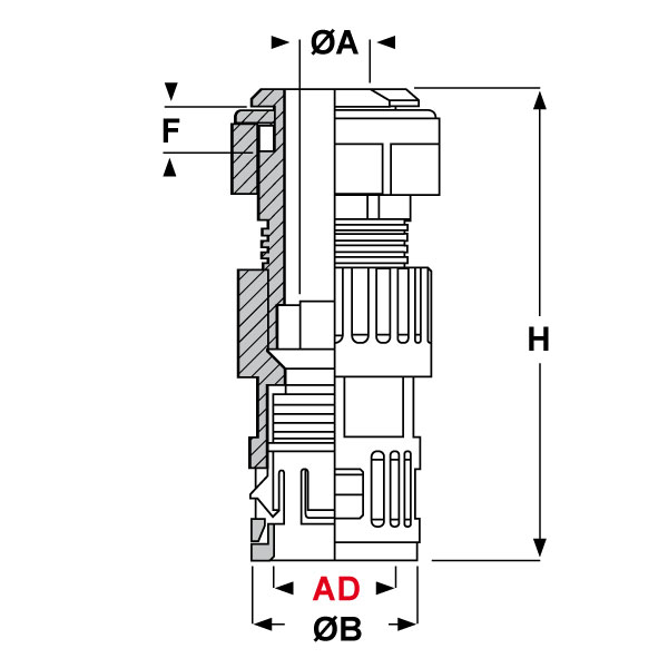 ARTICOLO | Ø esterno tubo AD | Ø est. cavo min - max mm | Ø foro montaggio mm | spessore telaio mm | ØA mm | ØB mm | F mm | H mm | chiave mm | confezione pz. | |