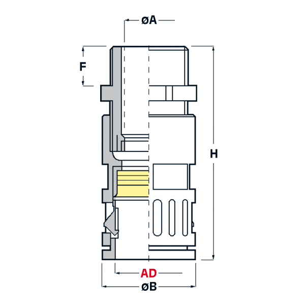 ARTICOLO | colore | Ø esterno tubo AD | filetto passo | filetto valore | Ø est. cavo min - max mm | ØA mm | ØB mm | F mm | H mm | chiave mm | confezione pz. | |