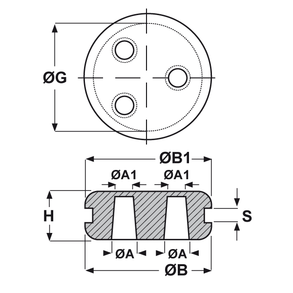 ARTICOLO | ØA mm | ØG mm | S mm | ØA1 mm | ØB mm | ØB1 mm | H mm | n. fori chiusi | confezione pz. | |