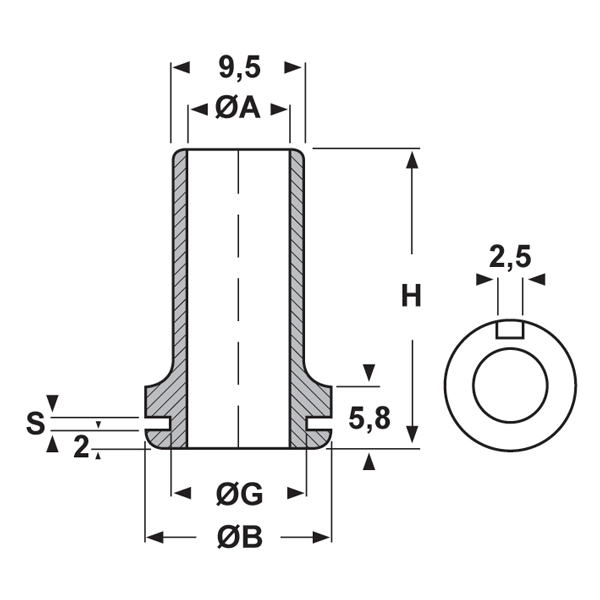ARTICOLO | materiale | ØA mm | ØB mm | ØG mm | H mm | S mm | confezione pz. |