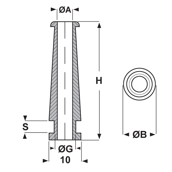 ARTICOLO | materiale | ØA mm | ØB mm | ØG mm | H mm | S mm | confezione pz. |