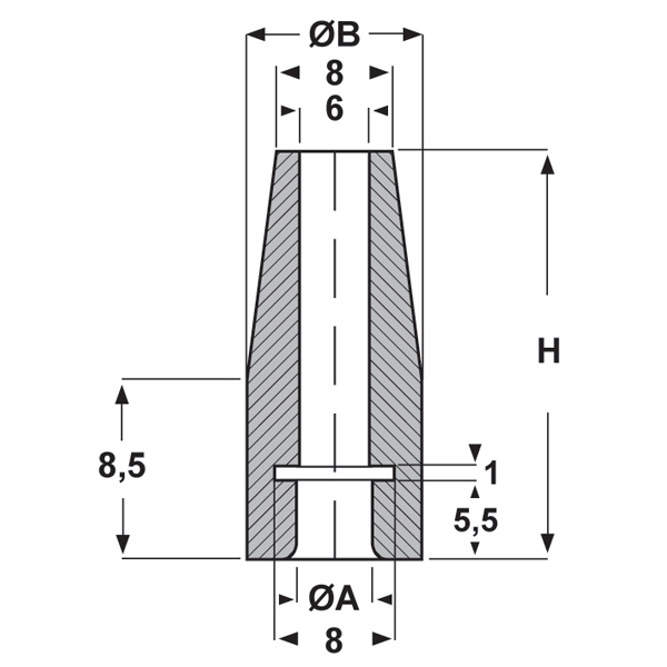ARTICOLO | materiale | ØA mm | ØB mm | ØG mm | H mm | confezione pz. |