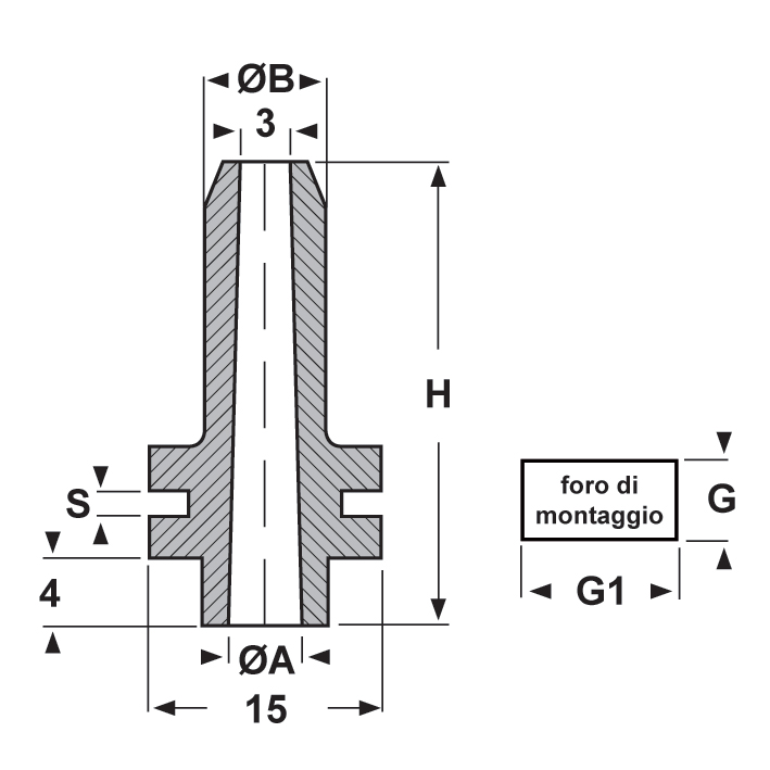 ARTICOLO | materiale | ØA mm | ØB mm | G mm | G1 mm | H mm | S mm | confezione pz. |