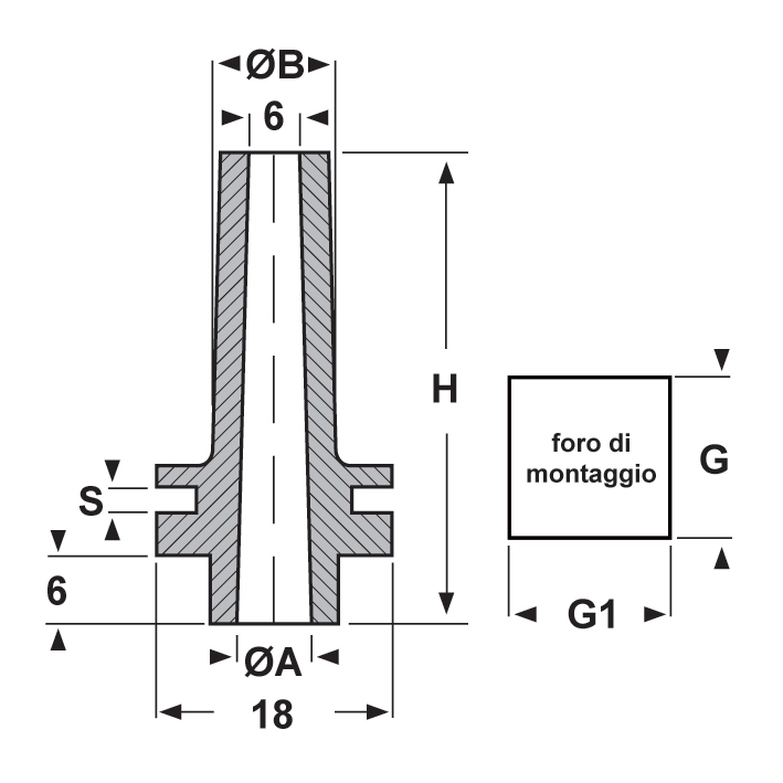 ARTICOLO | materiale | ØA mm | ØB mm | G mm | G1 mm | H mm | S mm | confezione pz. |