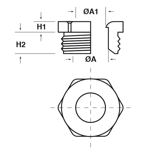 ARTICOLO | filetto passo | filetto valore | chiave mm | ØA mm | ØA1 mm | H1 mm | H2 mm | confezione pz. | |