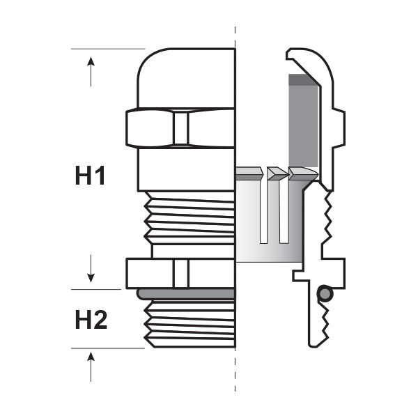 ARTICOLO | filetto passo | filetto valore | Ø est. cavo min - max mm | Ø est. calza min mm | chiave mm | H1 mm | H2 mm | confezione pz. | |