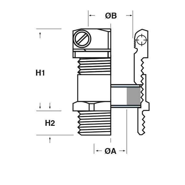ARTICOLO | filetto passo | filetto valore | chiave mm | ØA est. cavo min - max mm | ØB min - max mm | H1 mm | H2 mm | confezione pz. | |