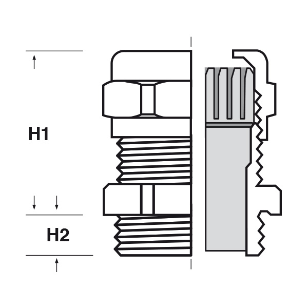 ARTICOLO | filetto passo | filetto valore | Ø est. cavo min - max mm | chiave mm | H1 mm | H2 mm | confezione pz. |