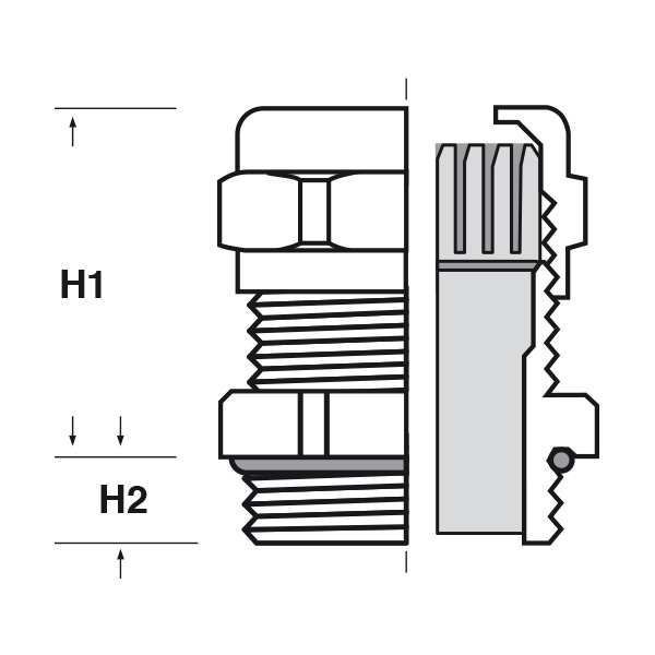 ARTICOLO | filetto passo | filetto valore | Ø est. cavo min - max mm | chiave mm | H1 mm | H2 mm | confezione pz. | |