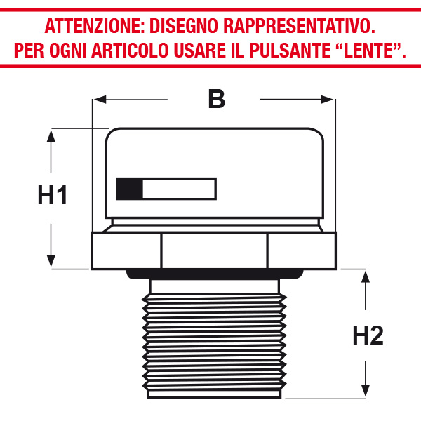 ARTICOLO | materiale | specifica | filetto passo | filetto valore | portata aria l/h | pressione penetrazione acqua bar/psi | H1 mm | H2 mm | ØB mm | chiave mm | confezione pz. | |