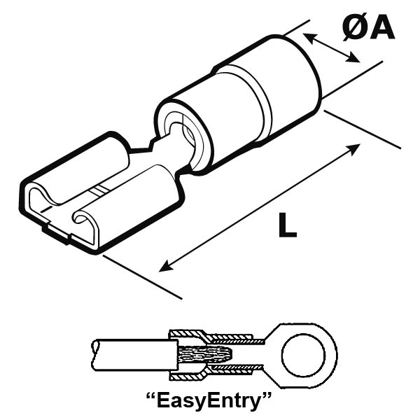 ARTICOLO | colore Isolamento | sezione mm2 | sezione AWG | per faston maschi | ØA mm | L mm | materiale isolamento | confezione pz. |